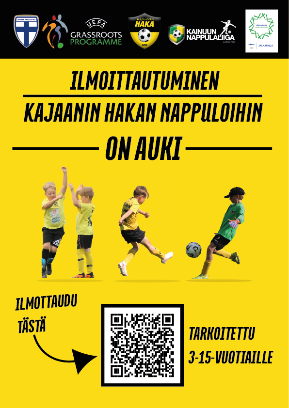 Tein itse flyerin Illustratorissa, mutta muokkasin kuvat taustattomiksi Photoshopissa ja tein Indesignissa QR-koodin. Tekstit ovat isolla ja näkyvällä fontilla. Valitsin fontin, koska se näytti aika paljon Kajaanin Hakan logossa olevalta fontilta. QR-koodi on testattu ja toimii hyvin ja oikein. Ilmoittautuminen näytetään selkeästi ja näytetään mistä ilmoittautua. Lasten kuvat näyttävät miten hauskaa muilla on ja, että muutkin lapset harrastavat. Tämä kiinnittää lapsen tai vanhemman huomion.